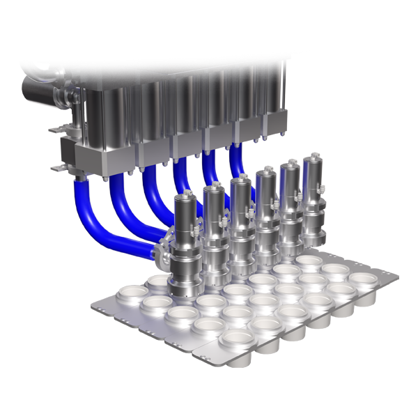 and optimized cycle times; its modularity allows accessory integration along the line. It’s compatible with cups of various materials, shapes, and sizes, provides quick format changeovers, and features servo-assisted stations for comprehensive control. It can be integrated with material sanitization systems to achieve ultra-clean packaging, particularly suited to dairy applications. Software with recipe management and advanced diagnostics reduces setup, downtime, and operating costs, contributing to high OEE.